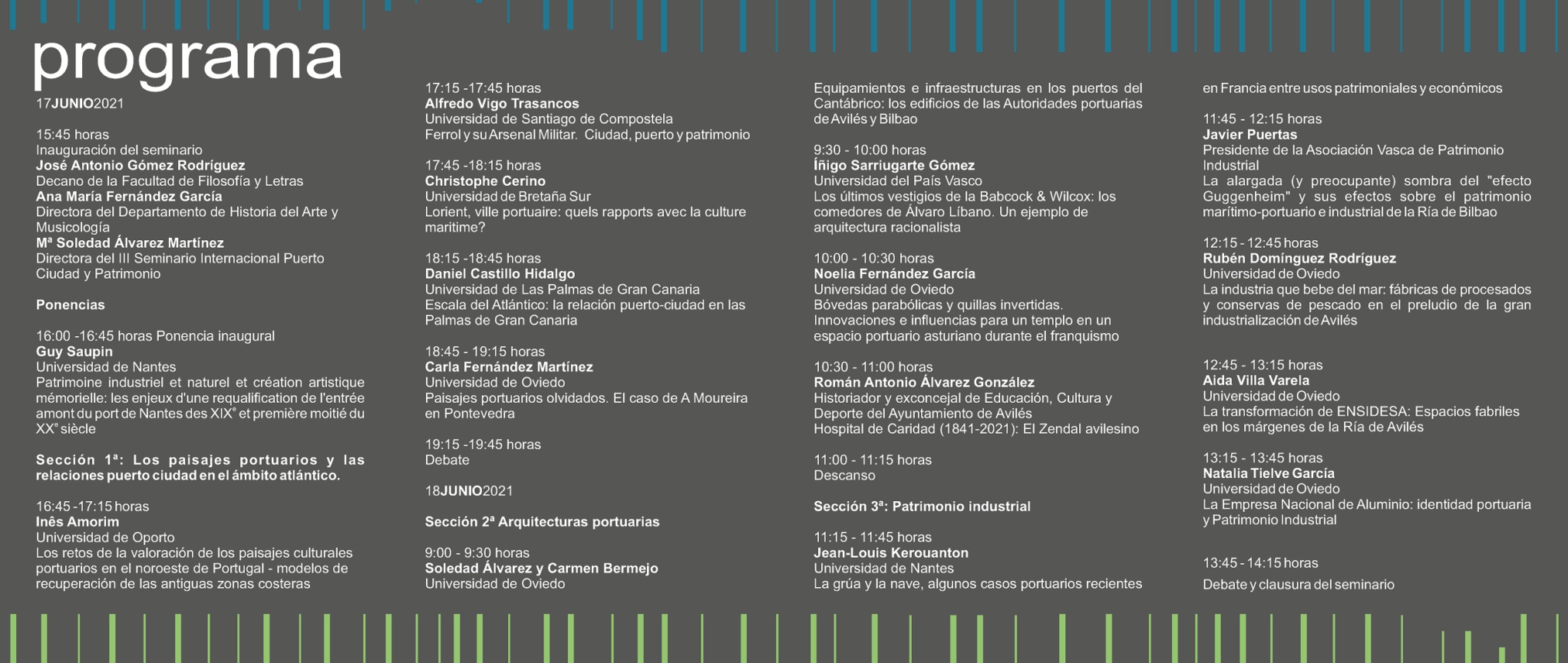 En este seminario se aborda el análisis de la incidencia que ha tenido la actividad portuaria e industrial en el desarrollo y trasformaciones de las ciudades atlánticas a través de tres secciones, dedicadas al estudio de los paisajes portuarios y las relaciones entre puerto y ciudad en el ámbito atlántico, a las arquitecturas portuarias y al Patrimonio Industrial.